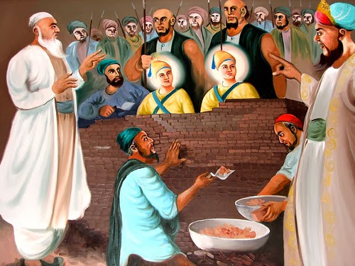 Baba Zorawar Singh and Baba Fateh Singh were captured along with their Grandmother, Mata Gujri Ji in the city of Sirhind. They were imprisoned overnight in an open tower with no food or water. In the following days, the younger Sahibzadey were taken to the governor of Sirhind, Wazir Khan, and he offered them their lives, freedom and wealth if they converted to Islam. The Sahibzadey refused and were bricked alive.(Picture is a painters impression not a photo)